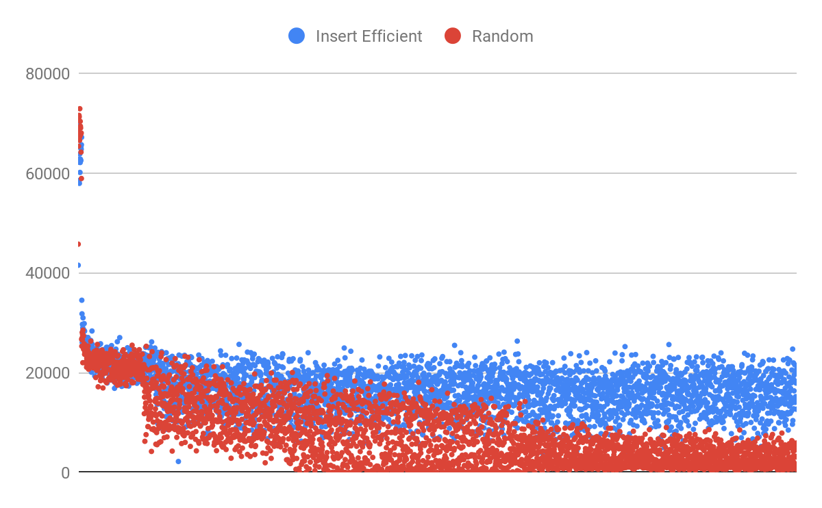So it is fair to say that the workload on Table B requires a higher memory fit than the workload on Table A. We could also improve performance by switching from RANDOM_BYTES(512) to something that is more insert efficient but still 512 bytes: